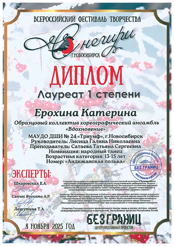 - Ерохина Катерина – Лауреат 1 степени в категории «13-15 лет»