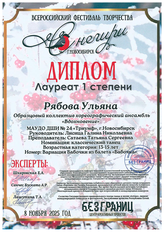 - Рябова Ульяна – Лауреат 1 степени в категории «13-15 лет»