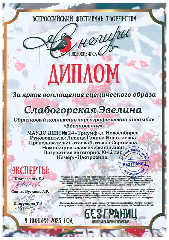 - Слабогорская Эвелина – Специальный диплом «За яркое воплощение сценического образа» в категории «10-12 лет»