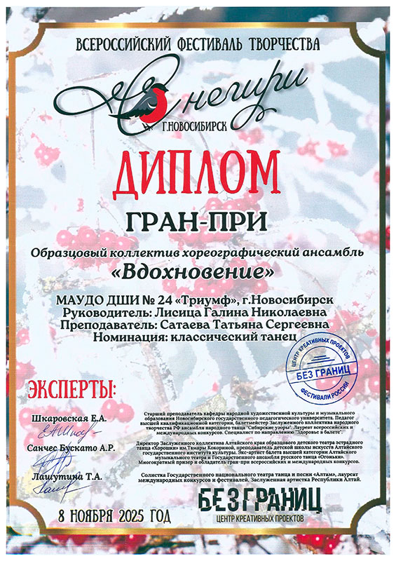 - Образцовый коллектив хореографический ансамбль «Вдохновение» – ГРАН-ПРИ в номинации «Классический танец».