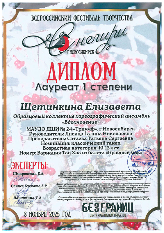 - Щетинкина Елизавета – Лауреат 1 степени в категории «10-12 лет»