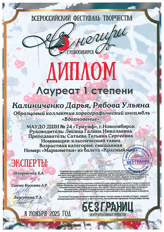 - Калиниченко Дарья, Рябова Ульяна) – Лауреат 1 степени в категории «дуэт»