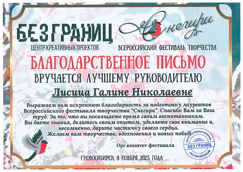 Лисица Г.Н. – Благодарственное письмо за подготовку лауреатов Всероссийского фестиваля творчества «Снегири».
