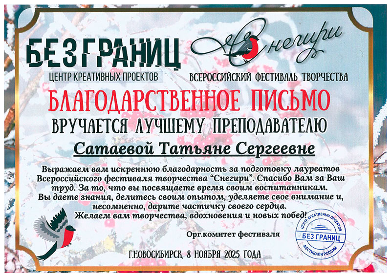 Сатаева Т.С. – Благодарственное письмо за подготовку лауреатов Всероссийского фестиваля творчества «Снегири».