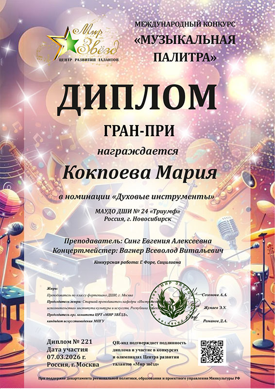 - Кокпоева Мария – Диплом ГРАН-ПРИ в номинации «Духовые инструменты»