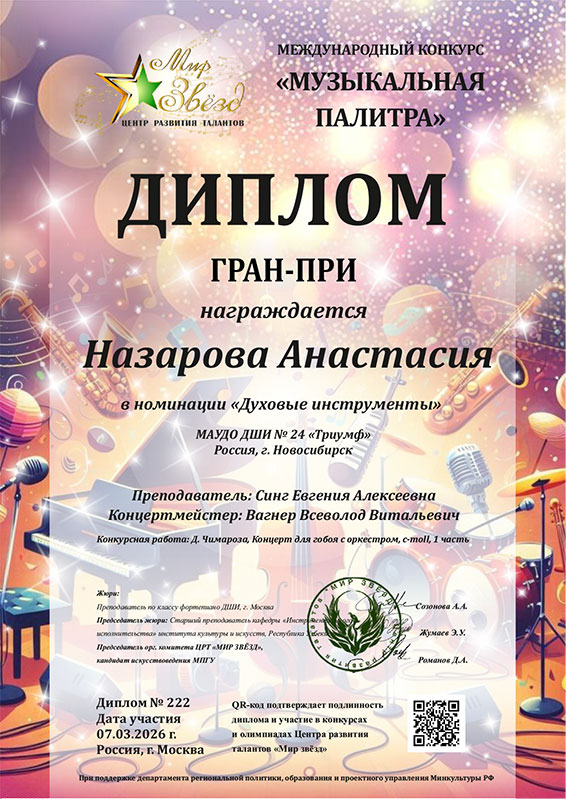 - Назарова Анастасия – Диплом ГРАН-ПРИ в номинации «Духовые инструменты»