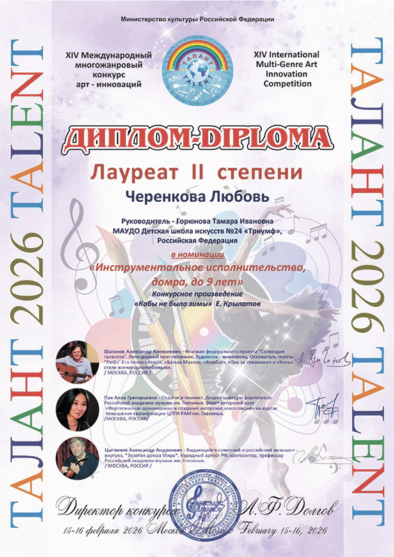 - Черенкова Любовь – Диплом лауреата II степени в номинации «Инструментальное исполнительство. Домра. До 9 лет»
