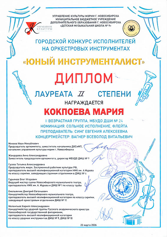 - Кокпоева Мария – Диплом лауреата II степени в номинации «Сольное исполнение. Флейта»
