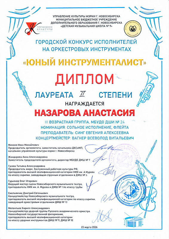 - Назарова Анастасия – Диплом лауреата II степени в номинации «Сольное исполнение. Флейта»