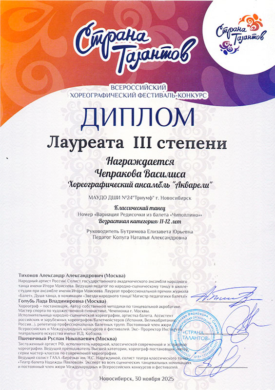 - Чепракова Василиса – Диплом лауреата III степени