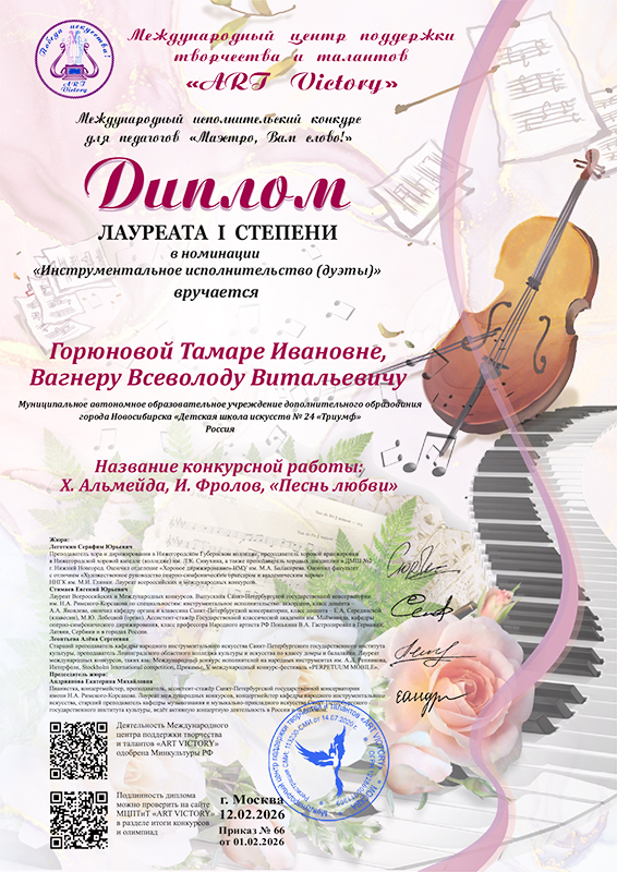 Для участия в Международном исполнительском конкурсе для педагогов ими была исполнена пьеса «Песнь любви» авторов Х. Альмейда и И. Фролова.