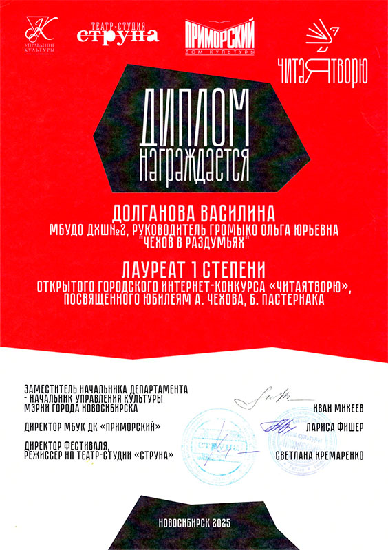 - Семёнова Дарья – Диплом лауреата 1 степени