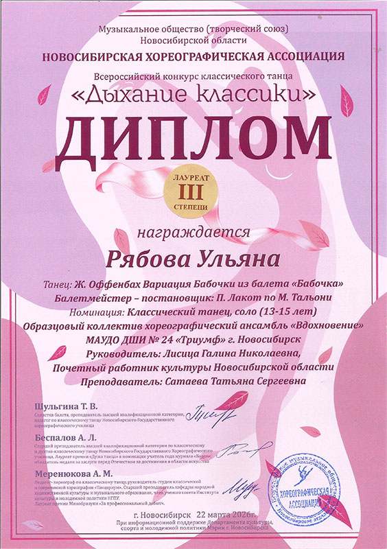 - Рябова Ульяна, танец «Вариация Бабочки из балета «Бабочка» – Диплом лауреата III степени в категории «13-15 лет»