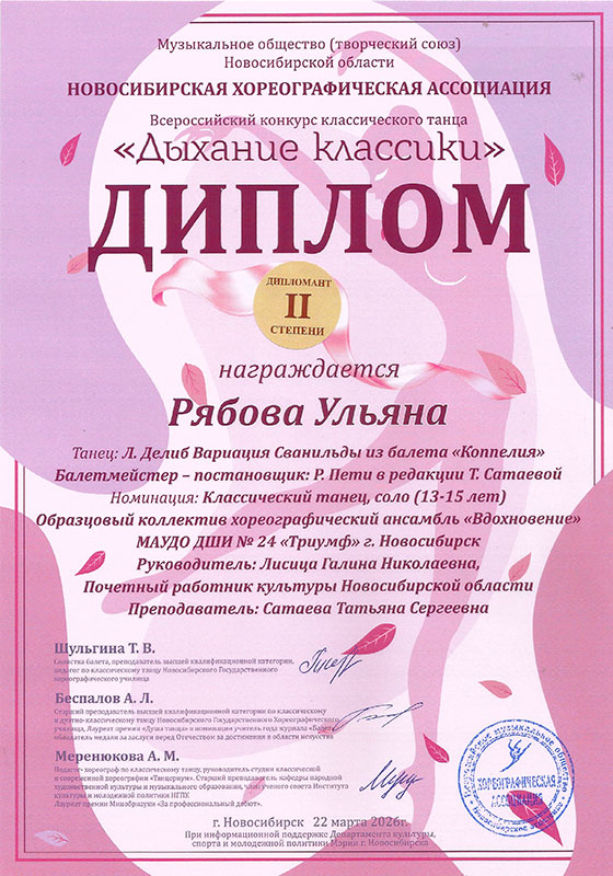 - Рябова Ульяна, танец «Вариация Сванильды из балета «Коппелия» – Диплом дипломанта II степени в категории «13-15 лет»