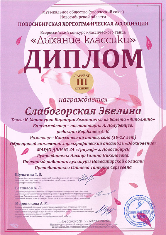 - Слабогорская Эвелина, танец «Вариация Землянички из балета «Чиполлино» – Диплом лауреата III степени в категории «10-12 лет»