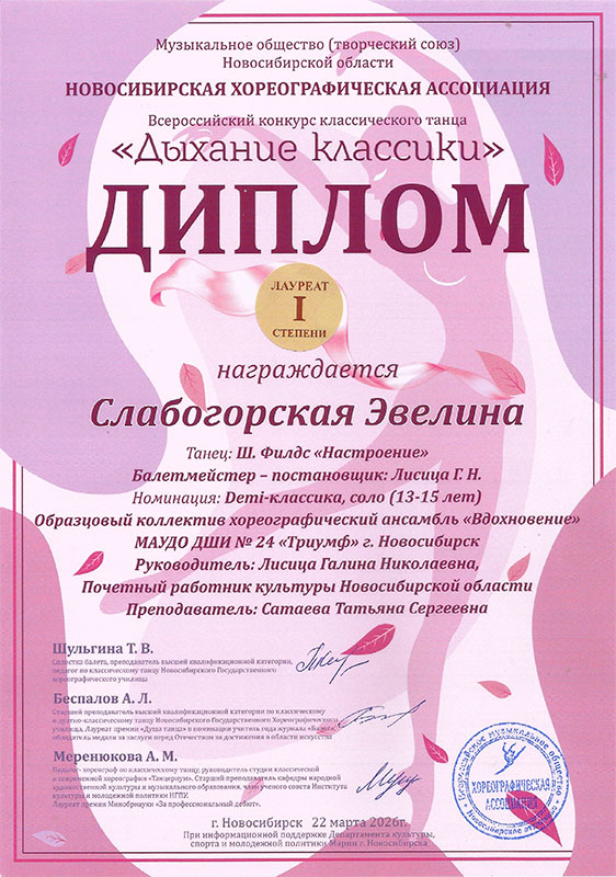 - Слабогорская Эвелина, танец «Настроение» – Диплом лауреата I степени в категории «10-12 лет»