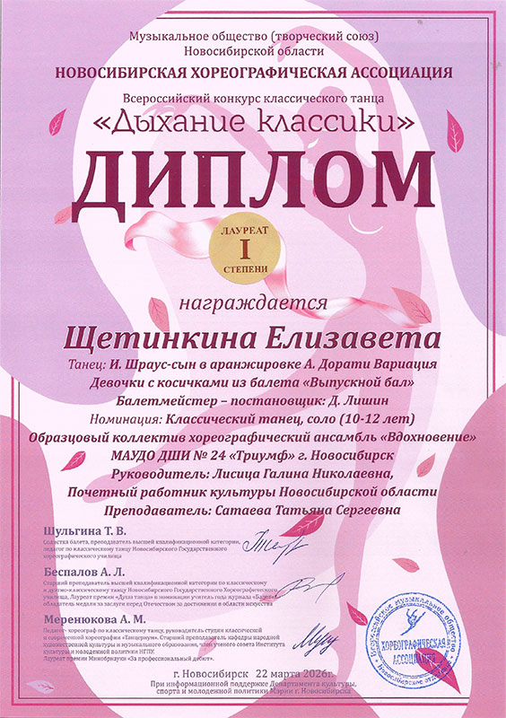 - Щетинкина Елизавета, танец «Вариация Девочки с косичками из балета «Выпускной бал» – Диплом лауреата I степени в категории «10-12 лет»