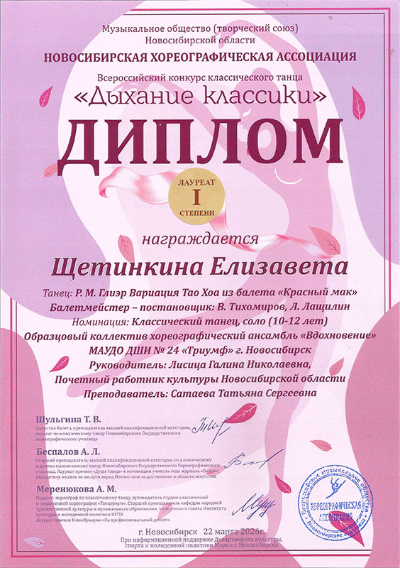 - Щетинкина Елизавета, танец «Вариация Тао Хоа из балета «Красный мак» – Диплом лауреата I степени в категории «10-12 лет»