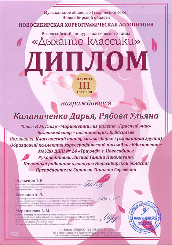 - Калиниченко Дарья, Рябова Ульяна, танец «Марионетки» из балета «Красный мак» – Диплом лауреата III степени в категории «смешанная группа»