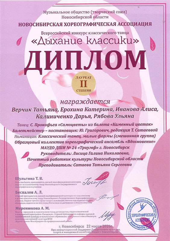 - Верчик Татьяна, Ерохина Катерина, Иванова Алиса, Калиниченко Дарья, Рябова Ульяна, танец «Самоцветы» из балета «Каменный цветок» – Диплом лауреата II степени в категории «смешанная группа»