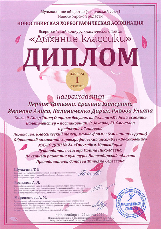 - Верчик Татьяна, Ерохина Катерина, Иванова Алиса, Калиниченко Дарья, Рябова Ульяна, «танец Озорных девушек» из балета «Медный всадник» – Диплом лауреата I степени в категории «смешанная группа»
