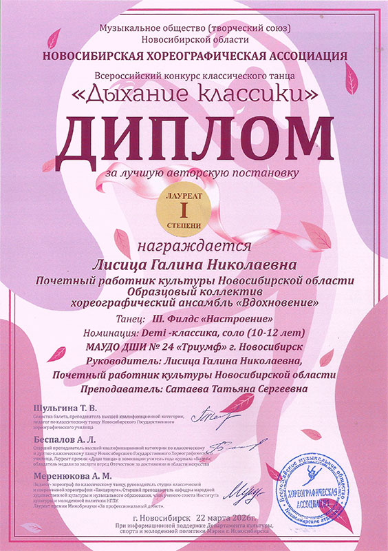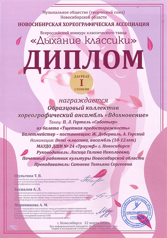 - Образцовый коллектив хореографический ансамбль «Вдохновение» – Диплом лауреата I степени в категории «10-12 лет»