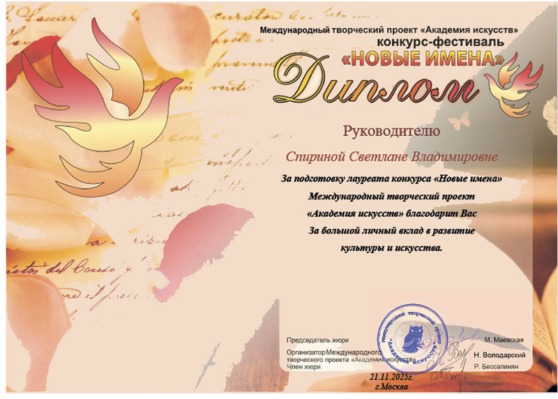 Преподаватель Спирина Светлана Владимировна, Почётный работник культуры Новосибирской областиКонцертмейстер Бочкарёва Евгения Геннадьевна