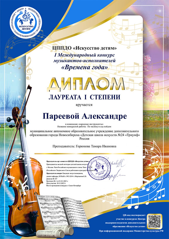- Пареева Александра – Диплом лауреата I степени в номинации «Народные инструменты»