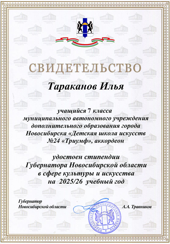 Илья Тараканов – ученик Анжелики Владимировны Артамошкиной по классу аккордеона (направление «Народные инструменты»).