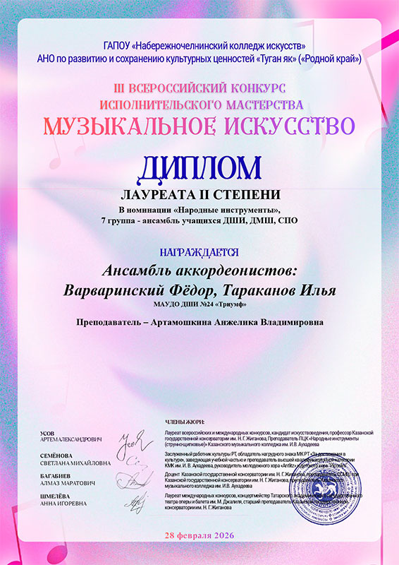 - Варваринский Федор, Тараканов Илья – Диплом лауреата III степени в номинации «Народные инструменты. Ансамбль»