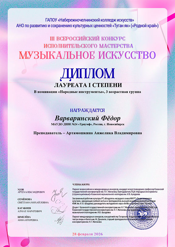- Варваринский Федор – Диплом лауреата I степени в номинации «Народные инструменты»
